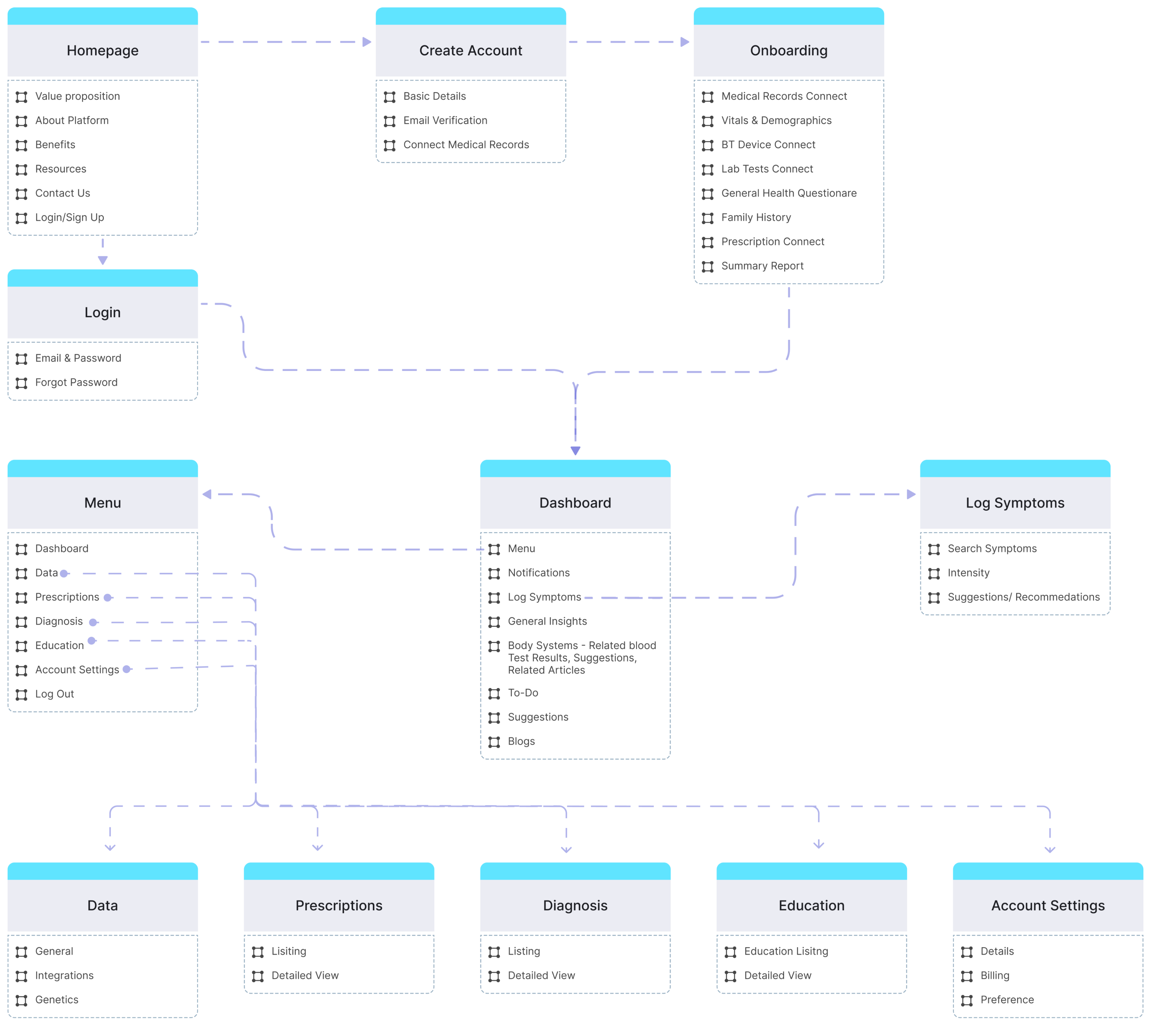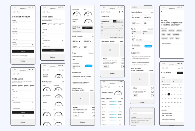 After thoroughly analyzing our research data, we developed a comprehensive sitemap for Beek Health, outlining all essential screens and features required for the Minimum Viable Product (MVP). This sitemap ensures that our platform effectively addresses user needs, focusing on seamless data integration, real-time health monitoring, and enhanced doctor-patient communication.